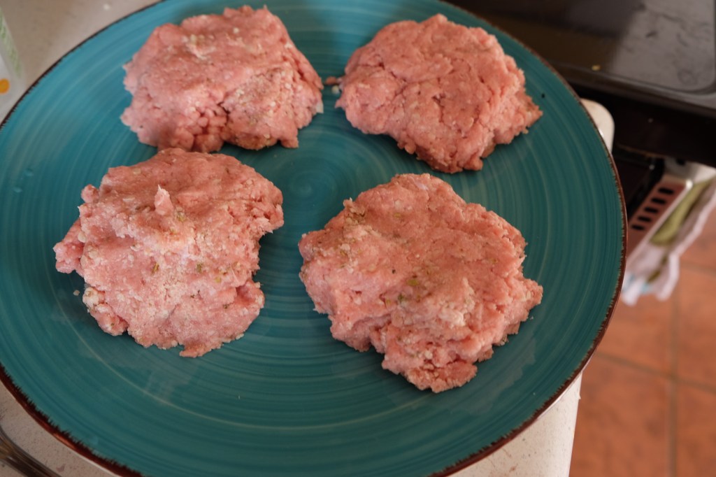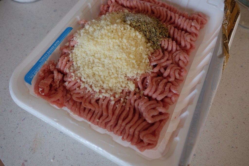 - Mix spices with parmesan cheese and ground turkey, forming 4 patties