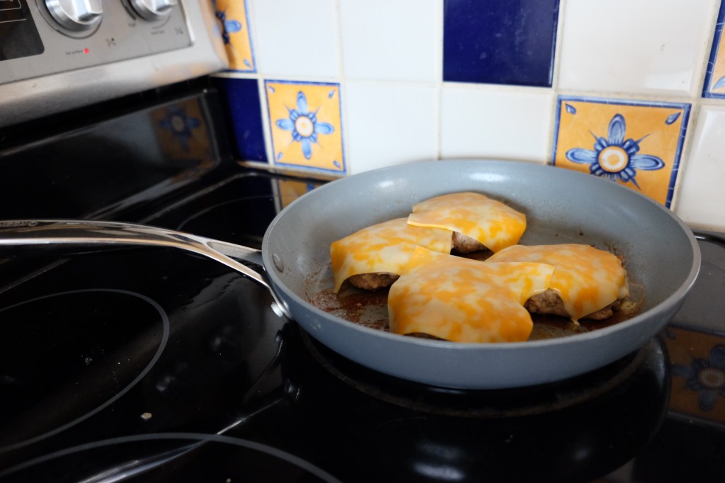 - Then uncover the lid to add cheese and let sit another minute. Then top with your favorite burger toppings and enjoy!